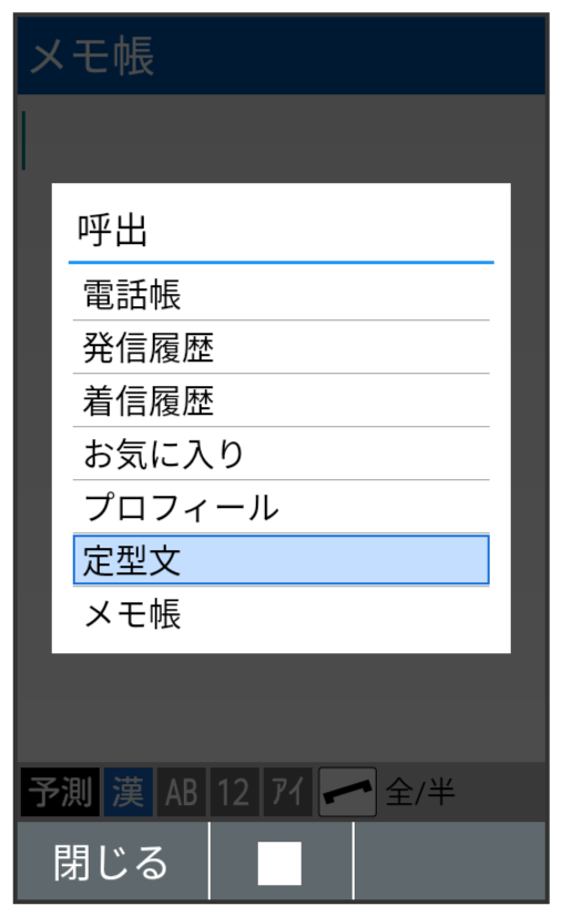 - 定型文メニュー画面でと操作すると、登録した定型文が利用できます。