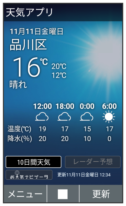 天気アプリ画面が表示されます。