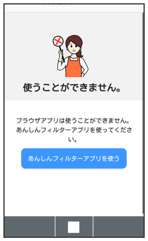 あんしんフィルターをご利用いただくと、デフォルトで通常のブラウザがブロックされて利用できなくなります。その場合はブロックされた画⾯のと操作してください。