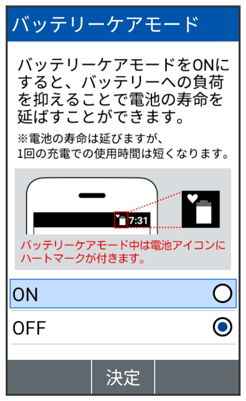バッテリーケアモード画面が表示されます。