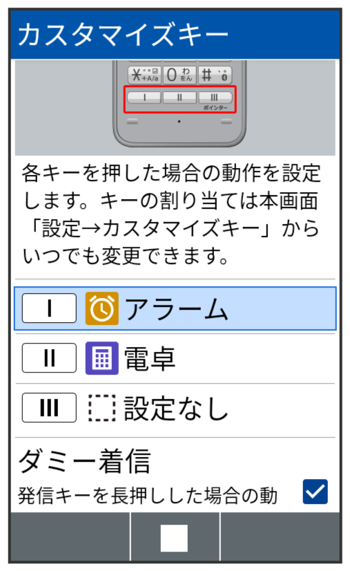 待受画面にカスタマイズキーに割り当てられている機能を表示するかどうかを設定する