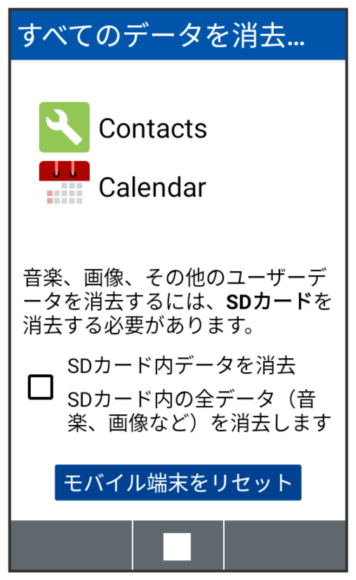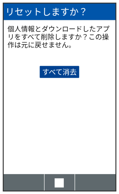 すべてのデータを消去(初期状態にリセット)すると、本体メモリのデータがすべて消去されます。必要なデータは事前にバックアップをとることをおすすめします。