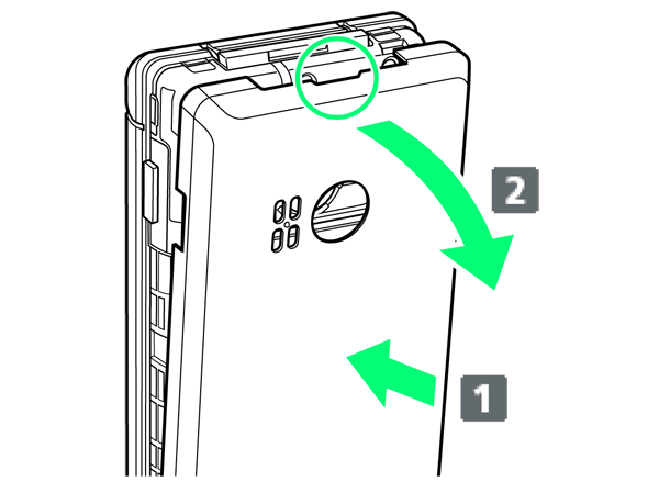- 電池カバーを本体に合わせて置き、〇の位置をしっかりと押して、本体との間にすき間がないことを確認してください。