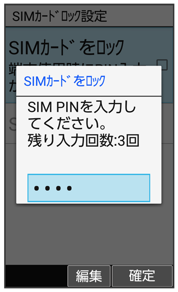 SIMカードロック設定中に、SIMカードロック設定画面でPINコードを入力
