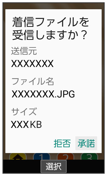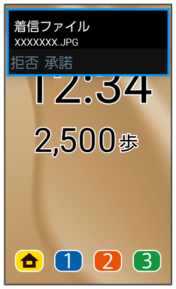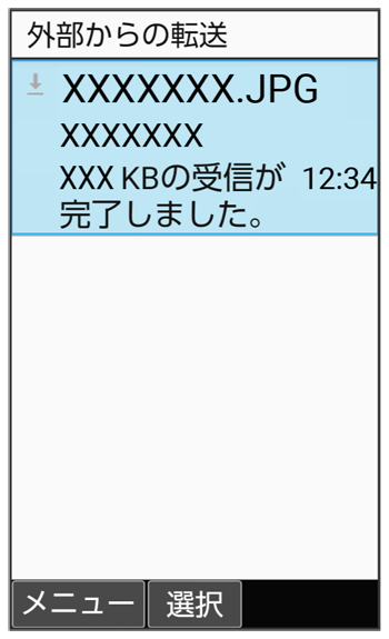 相手からデータの受信要求があると、Bluetooth®着信ファイル通知が表示されます。次の操作を行うと、受信することができます。