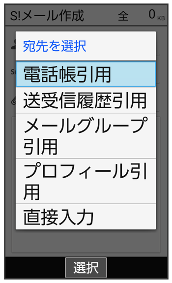 S!メール送信時に電話帳を利用して宛先を入力する方法を例に説明します。