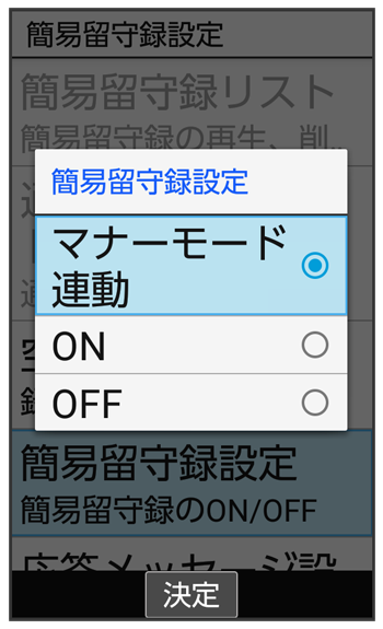 - に設定した場合は、マナーモードを有効にしているときに、簡易留守録が有効になります。