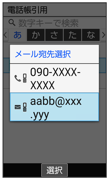 - と操作すると、メールグループを選択して、メールグループに登録されたすべての宛先を送信する宛先に設定できます。
