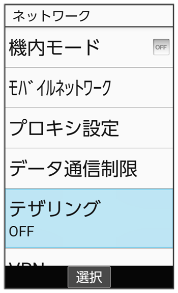 | Bluetoothテザリング | Bluetooth®接続でテザリング機能を利用するかどうかを設定します。 |