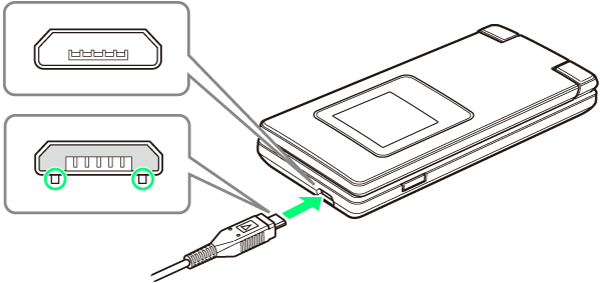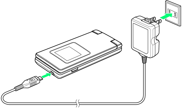ACアダプタはオプション品です。ソフトバンク指定のACアダプタをお使いください。ACアダプタ、およびその他の周辺機器についてはソフトバンクのホームページを参照してください。ここでは、ACアダプタ[SB-AC13-HDMU]を使用して充電する方法を例に説明します。