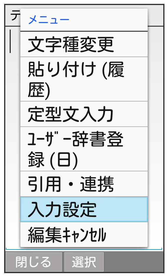 | 入力補助・変換 | 予測変換、自動カーソル移動などを設定できます。 |