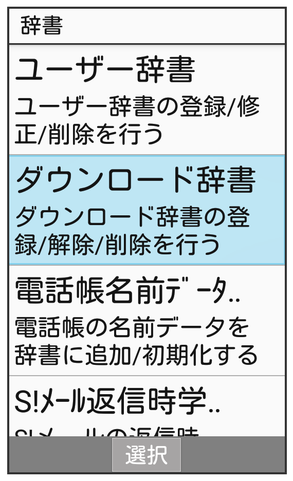 (メニュー)と操作して、メーカーサイトからダウンロード辞書を取得します。以降は、画面に従って操作してください。