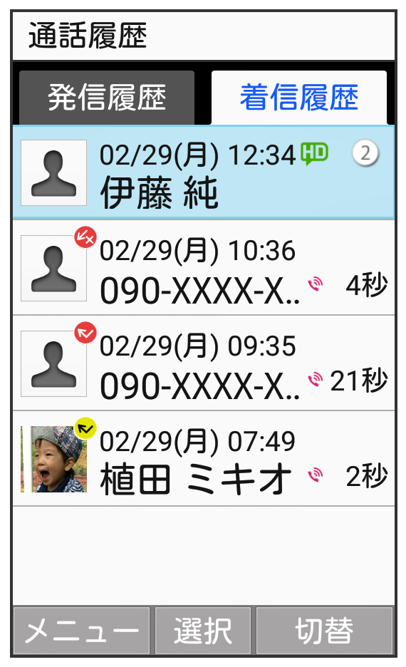 発信/着信履歴一覧画面で履歴を選択- やなどを選択すると、それぞれの番号を付加することができます。