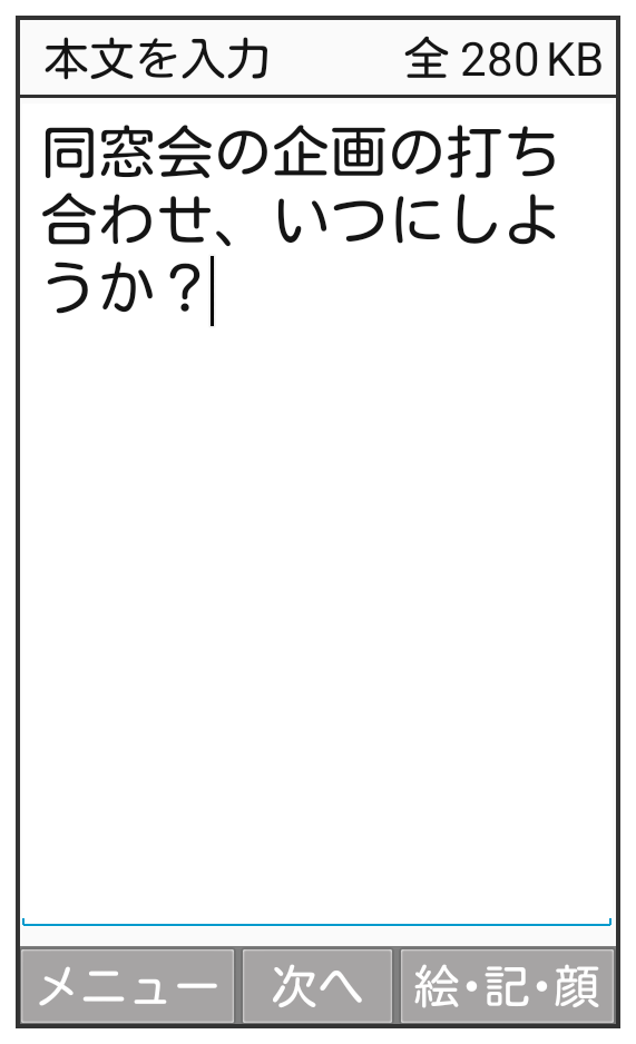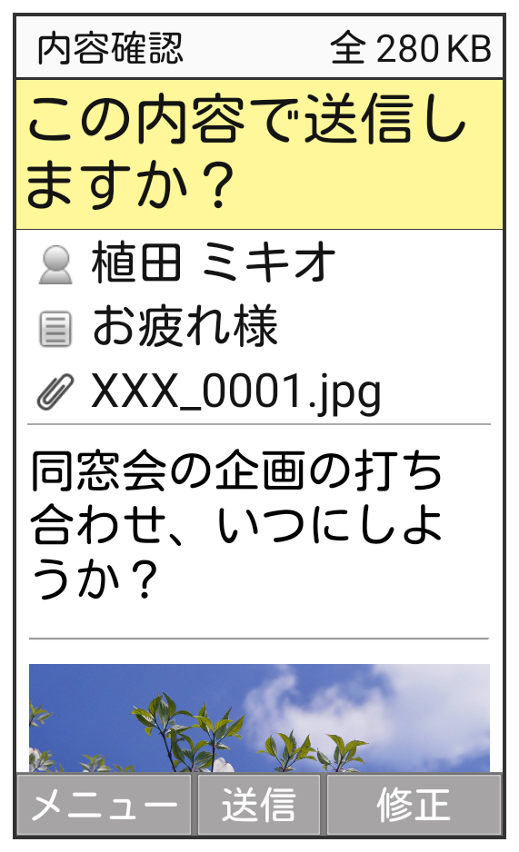 宛先の入力方法やメール内容確認画面での操作はと同様です。詳しくは、「文章のみを送信する」を参照してください。