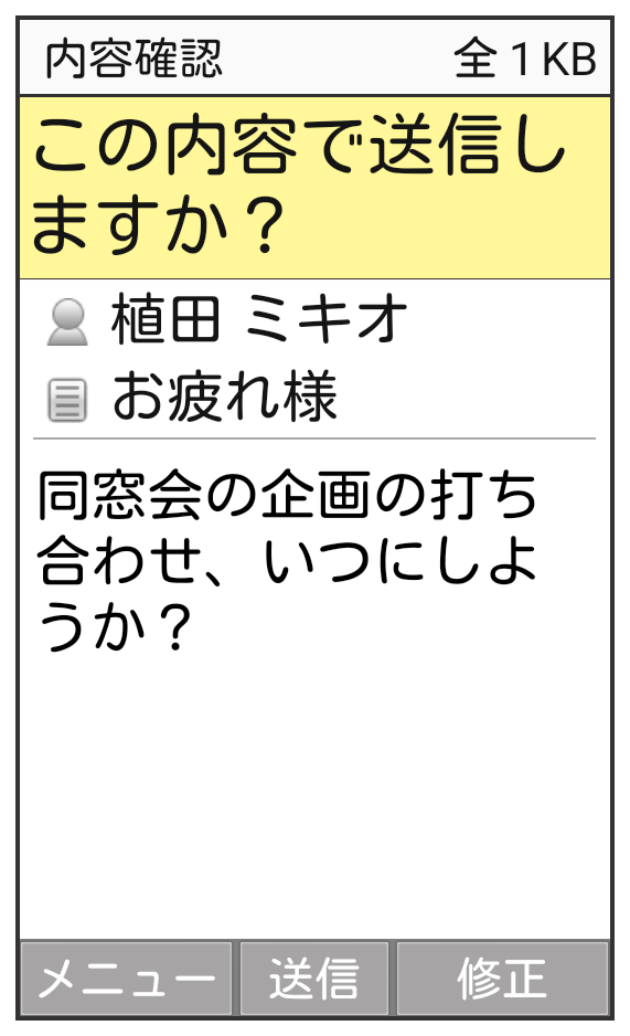 メール内容確認画面での操作はと同様です。詳しくは、「文章のみを送信する」を参照してください。