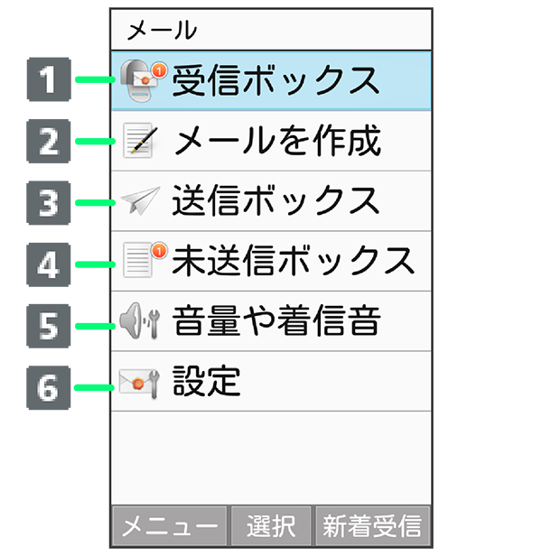 - 受信ボックス/送信ボックスの未読メール/未送信メールの件数は表示されません。