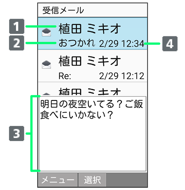 受信/送信/未送信メール一覧画面でメールを選択- タイムスタンプやサイズ、メールの種別などが表示されます。