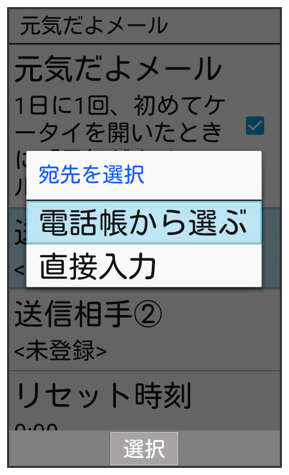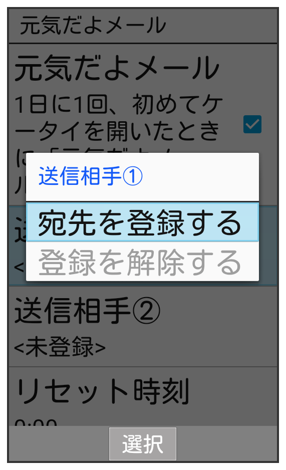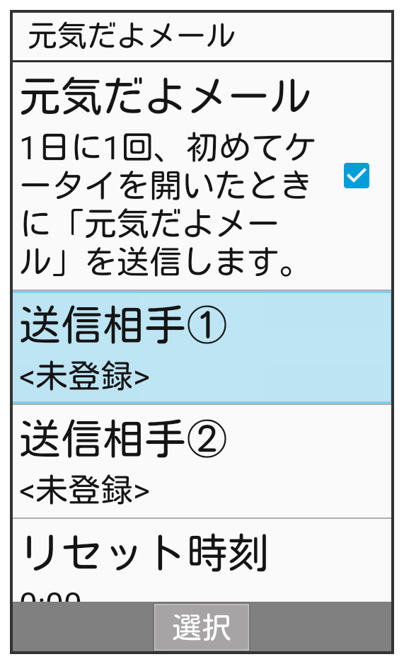 元気だよメールを利用するための設定を行います。電話帳から連絡先を選んで、「送信相手①」に登録する方法を例に説明します。