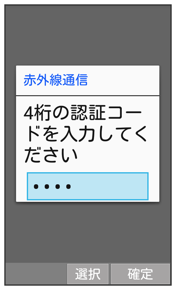- 認証コードは、正しい通信相手かどうかをお互いに確認するための暗証番号です。送信側/受信側で同じ数字(4桁)を入力します(特に決まった数字はなく、その通信限りのものです)。