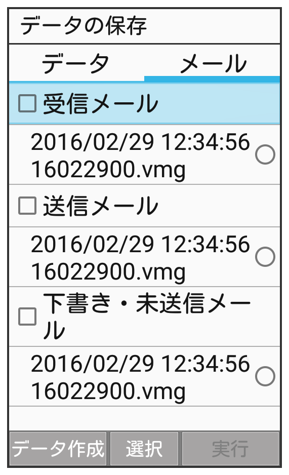 (データ作成)を押すと、本体のメールデータをSDカードに保存できます。