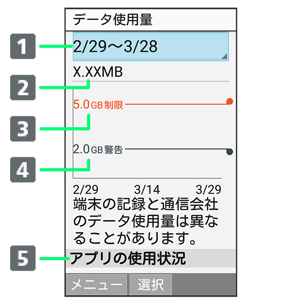 データ使用量確認のサイクルを表示/サイクル表示のリセット(初期化)日を設定1 - データ使用量