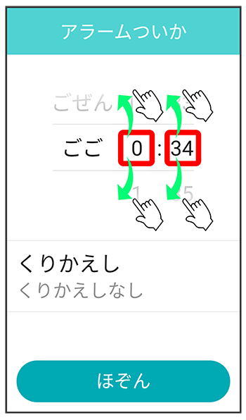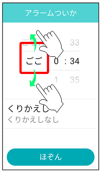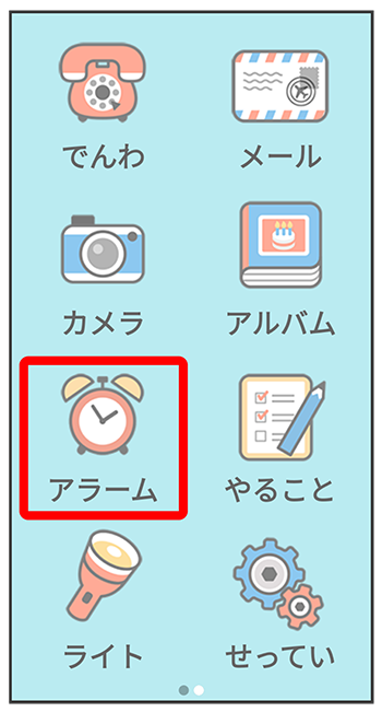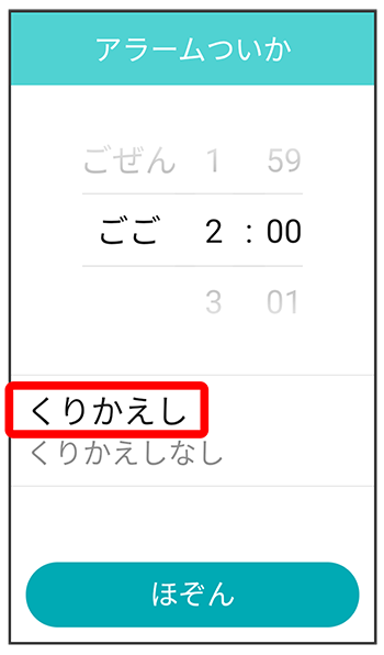 - を設定しなかったアラームには「くりかえしなし」と表示されます。その他の曜日にチェックを付けたアラームには、設定した曜日が表示されます。毎日に設定すると「まいにち」と表示されます。