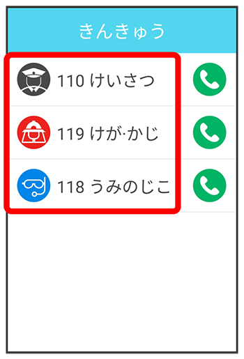 110番(警察)、119番(消防・救急)、118番(海上保安庁)へ発信できます。