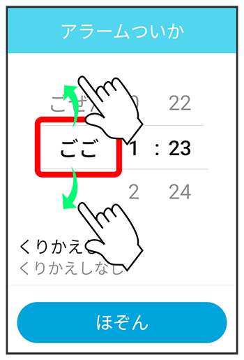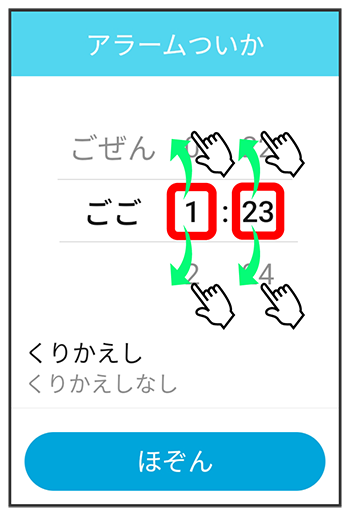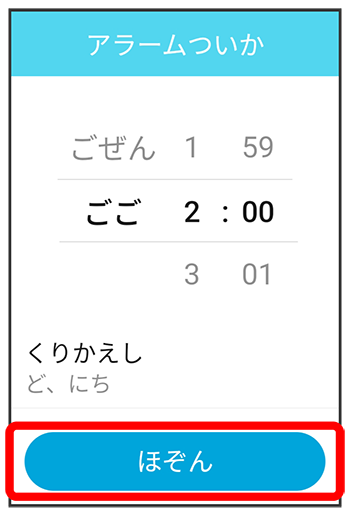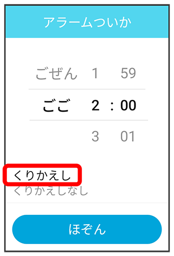- を設定しなかったアラームには「くりかえしなし」と表示されます。特定の曜日にチェックを付けたアラームには、設定した曜日が表示されます。すべての曜日にチェックを付けると「まいにち」と表示されます。