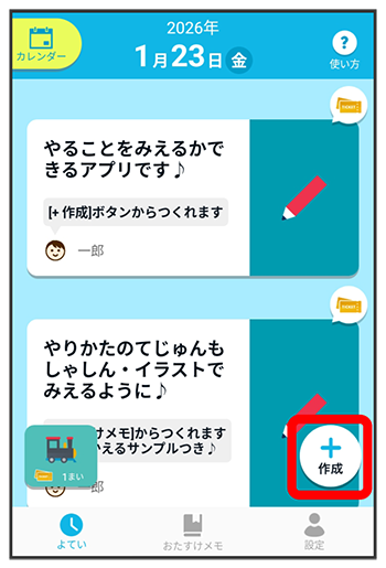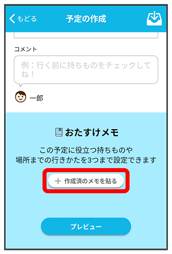 - 予定には作成済のおたすけメモを3つまで貼ることができます。詳しくは「予定におたすけメモを貼る」を参照してください。
