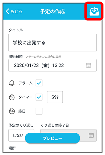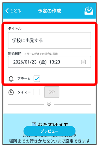 予定のタイトル、開始日時、アラームを設定