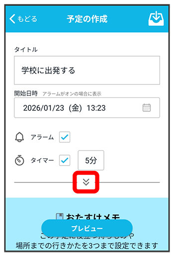 予定を実行する目安の時間を決めたい場合は、「タイマー」にチェックを付けるタイマー時刻を設定