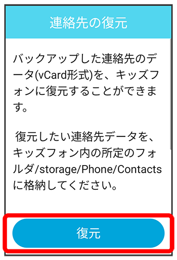 - 事前に復元したい連絡先データを、本機内の所定のフォルダ「/Phone/Contacts」に格納してください。