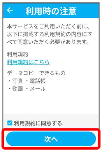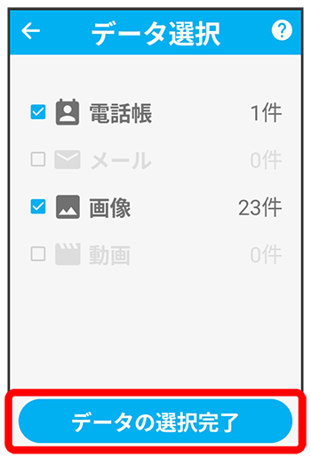 - コピーできるデータの種類は写真/電話帳/動画/メールです。