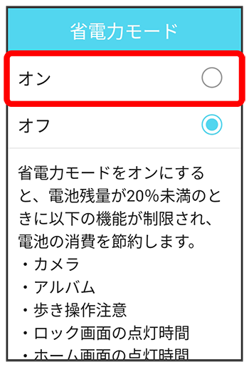 - 電池残量が20%以下になると省電力モードが開始されます。バックライトやモバイルライトの明るさが暗くなったり、画面の消灯時間が短くなります。また、カメラやアルバム、モバイルライト、歩き操作注意の機能が使用できなくなります。