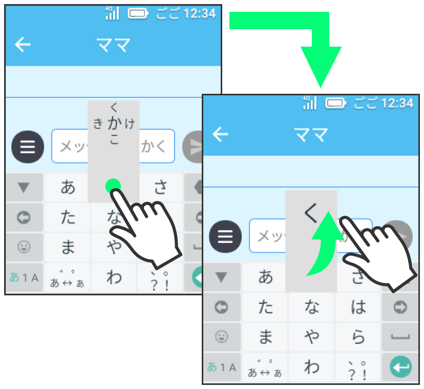 キーを上下左右にフリックすることで、キーを繰り返しタップすることなく、入力したい文字を入力できます。キーに触れると、フリック入力で入力できる候補が表示されます。入力したい文字が表示されている方向にフリックすると、文字が入力されます。