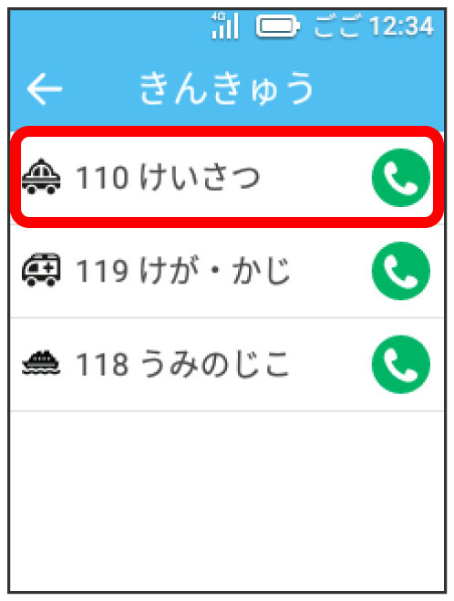 110番(警察)、119番(消防・救急)、118番(海上保安庁)へ発信できます。