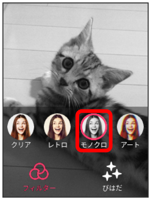 フィルターを利用すると、画像の色調を変更したり、美肌効果で肌色を調節したりして撮影できます。