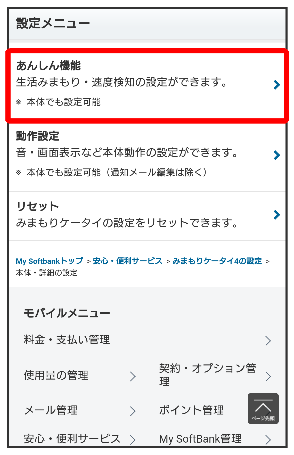 あんしん機能画面が表示されます。