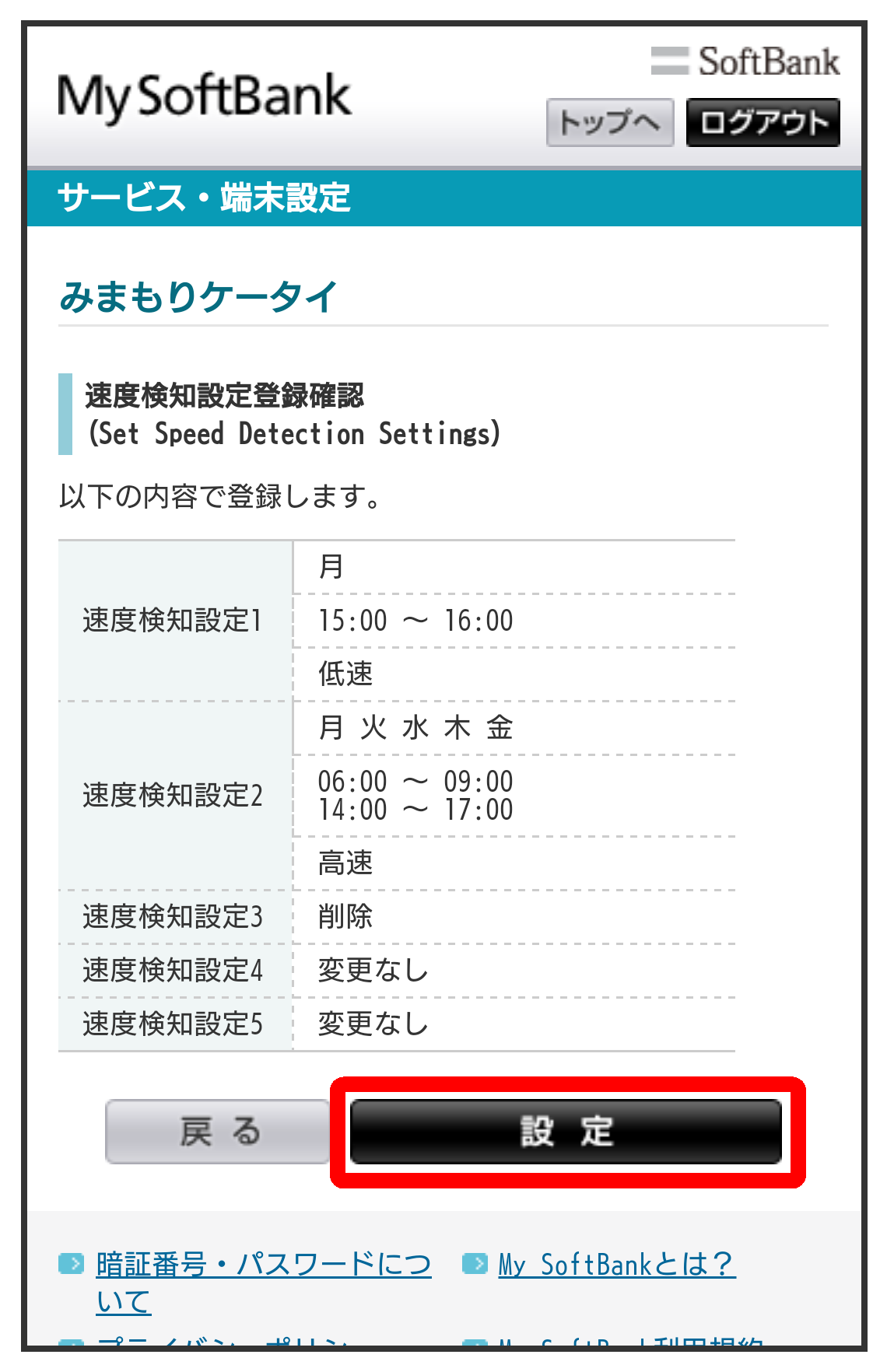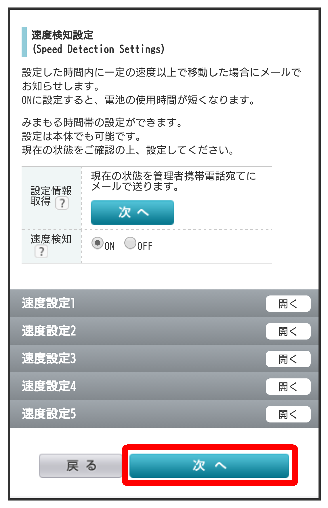 あんしん機能画面で速度検知設定の設定情報取得の