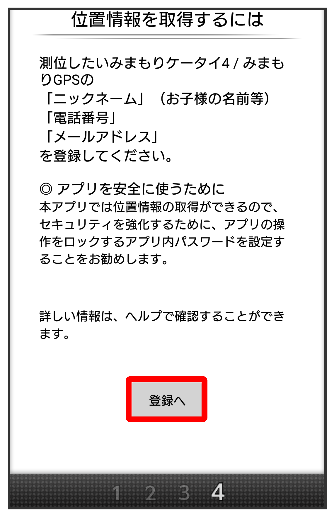 みまもりGPSアプリをはじめて起動したときの、登録手順を説明しています。