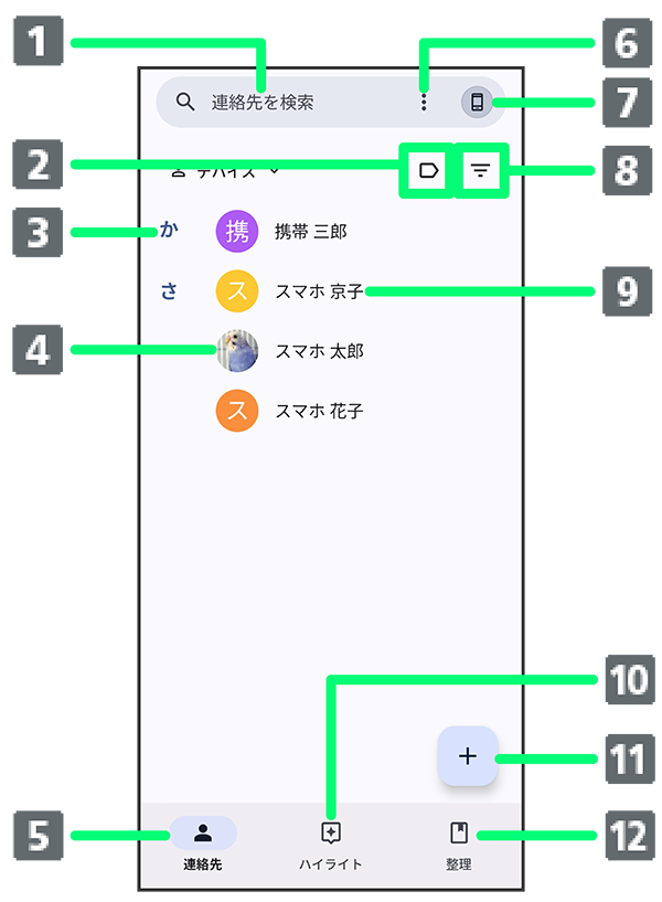 | 選択アイコン | 連絡先を選択/すべて選択して共有や削除の操作などができます。 |