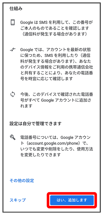 - セキュリティ保護目的でのみ電話番号を追加するときは、をタップします。以降は画面の指示に従って操作してください。