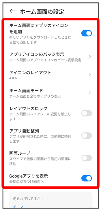 | レイアウトのロック | ホーム画面のレイアウトを固定するかどうかを設定します。 |