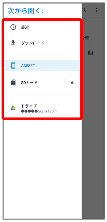- SDカードはSDカードを挿入している場合、Google ドライブはGoogle アカウントを設定している場合に表示されます。