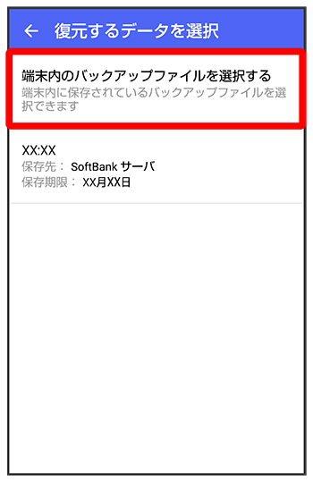 - バックアップしたデータが表示されている場合は、内部ストレージ/SDカード/Google ドライブからバックアップデータを選択し、手順