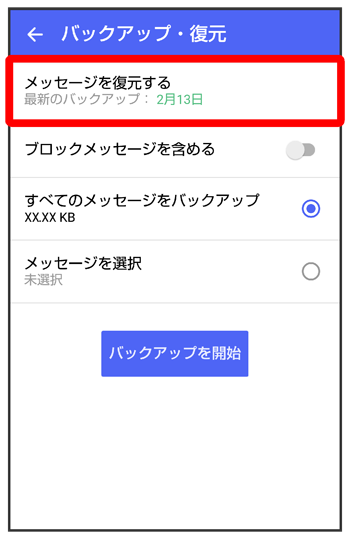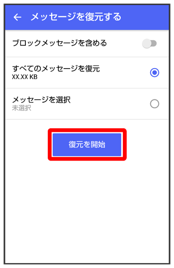 - ブロックしたメッセージを含めて復元する場合はを有効(