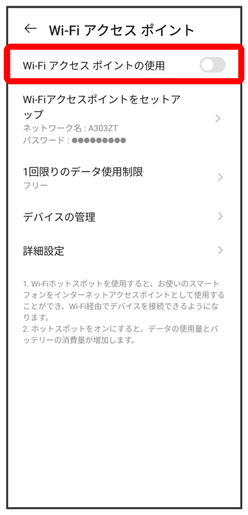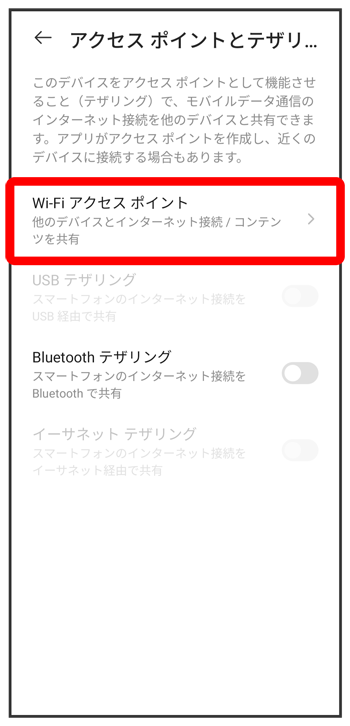 アクセス ポイントとテザリング画面が表示されます。
