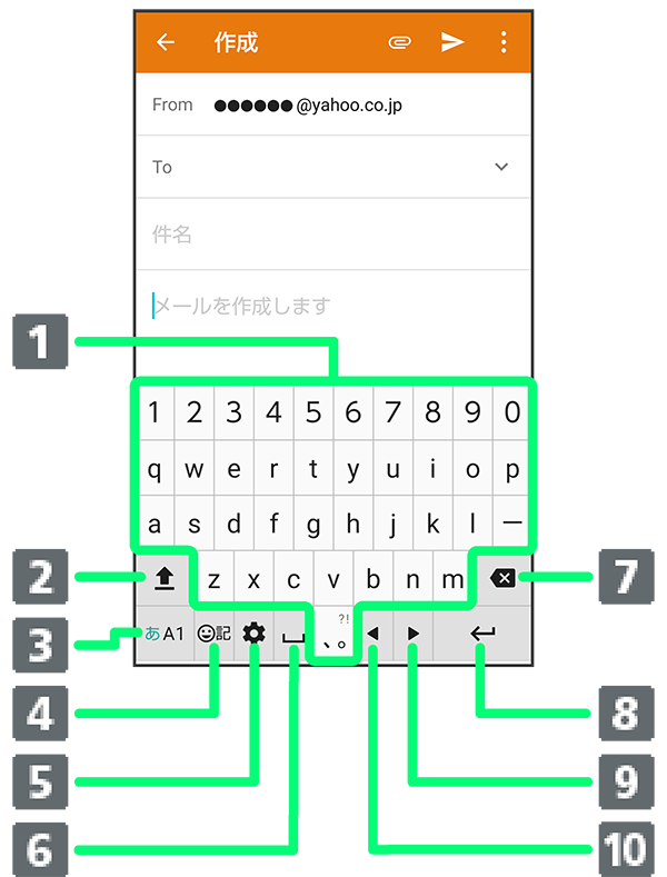 - 絵文字/記号/顔文字を入力(右にフリックすると、アプリ連携・引用一覧を表示。文字入力中は、カタカナ/英字変換2)