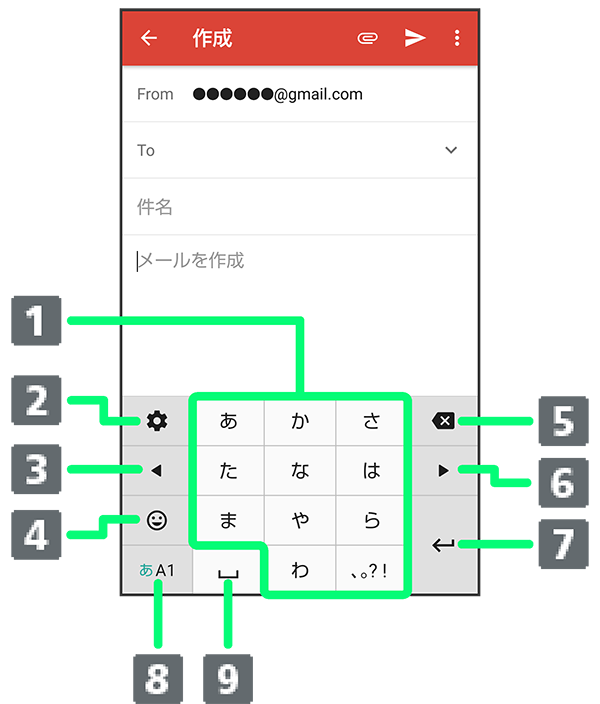 - カーソルを左に移動(上下右にフリックすると、カーソルを上下右に移動。文字入力中は、変換の区切りを変更)