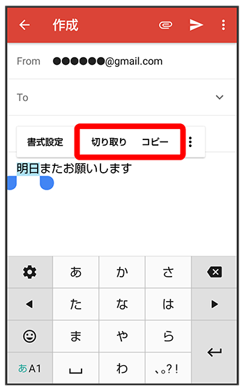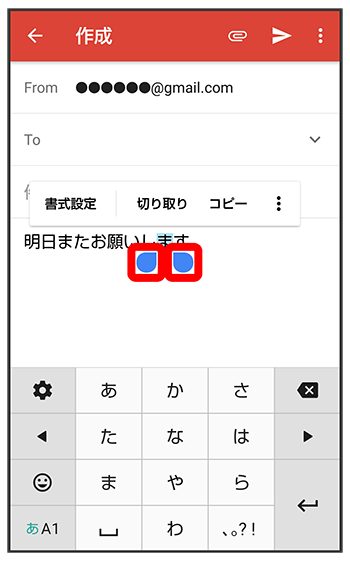 を左右にドラッグして、切り取り/コピーする文字を選択